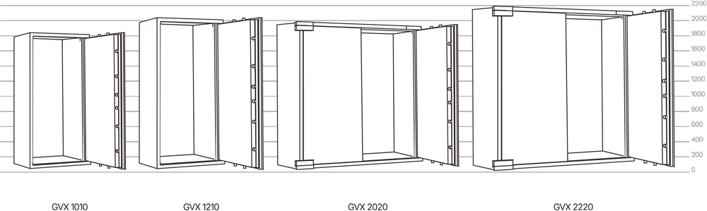 GVX 2020 et GVX 2220 : Avec des volumes de 1945 L et 2155 L, et équipés de deux portes, ces coffres sont conçus pour les organisations ayant des besoins de stockage plus importants, offrant l'espace et la sécurité d'une véritable chambre-forte.